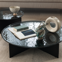 Rolf Benz KIOは、ガラスの天板とスチールの脚で構成されており、素材の組み合わせが持つシンプルな美しさにインスピレーションされデザインされました。凹凸のあるガラストップは、一つ一つ個性があり同じものがないため、特別感とオブジェのような存在感を演出します。有機的なフォルムのガラストップとシンプルで無機質なスチール脚のコントラストが美しいテーブルです。