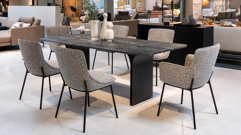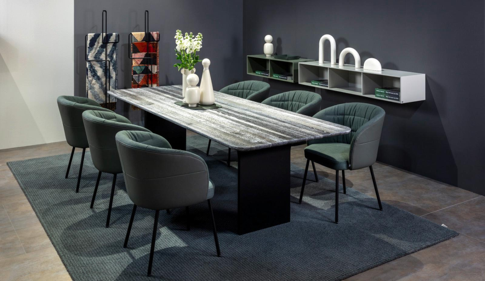 Rolf Benz 990 は、純粋なエレガンスにモダンな外観を与えます。 印象的な感触を持つ頑丈な手磨きのテーブルトップは、狭い粉体塗装のパネルの上に浮かんでいるように見えます。 テーブルトップに向かって花のように開きます。